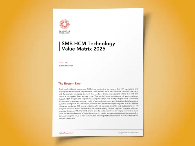 Nucleus Research, a leading independent analyst firm, named isolved a leader for the second consecutive year in its HCM Value Matrix for Small-and Medium-Sized Businesses. The firm’s report evaluates HCM vendors to equip HR decision-makers with the information they need to guide their final purchasing decisions.