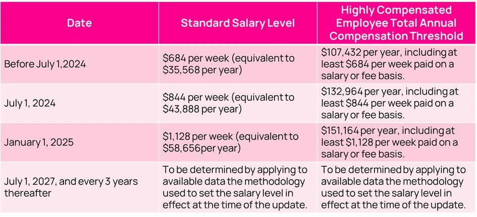 Starting July 1, employees earning $132,964 or more will be classified as exempt from overtime provisions. These employees must meet the duties test and the salary level for the Exempt status.
