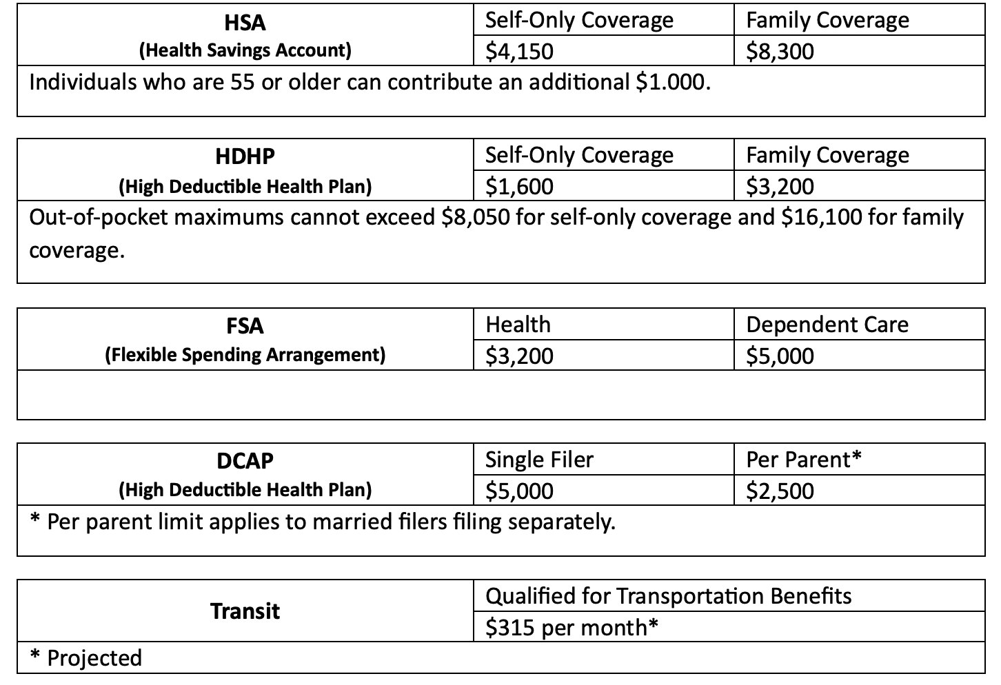The HSA contribution limits are $3,850 for self-only coverage and $7,750 for family coverage. Individuals who are 55 or older can contribute an additional $1,000.