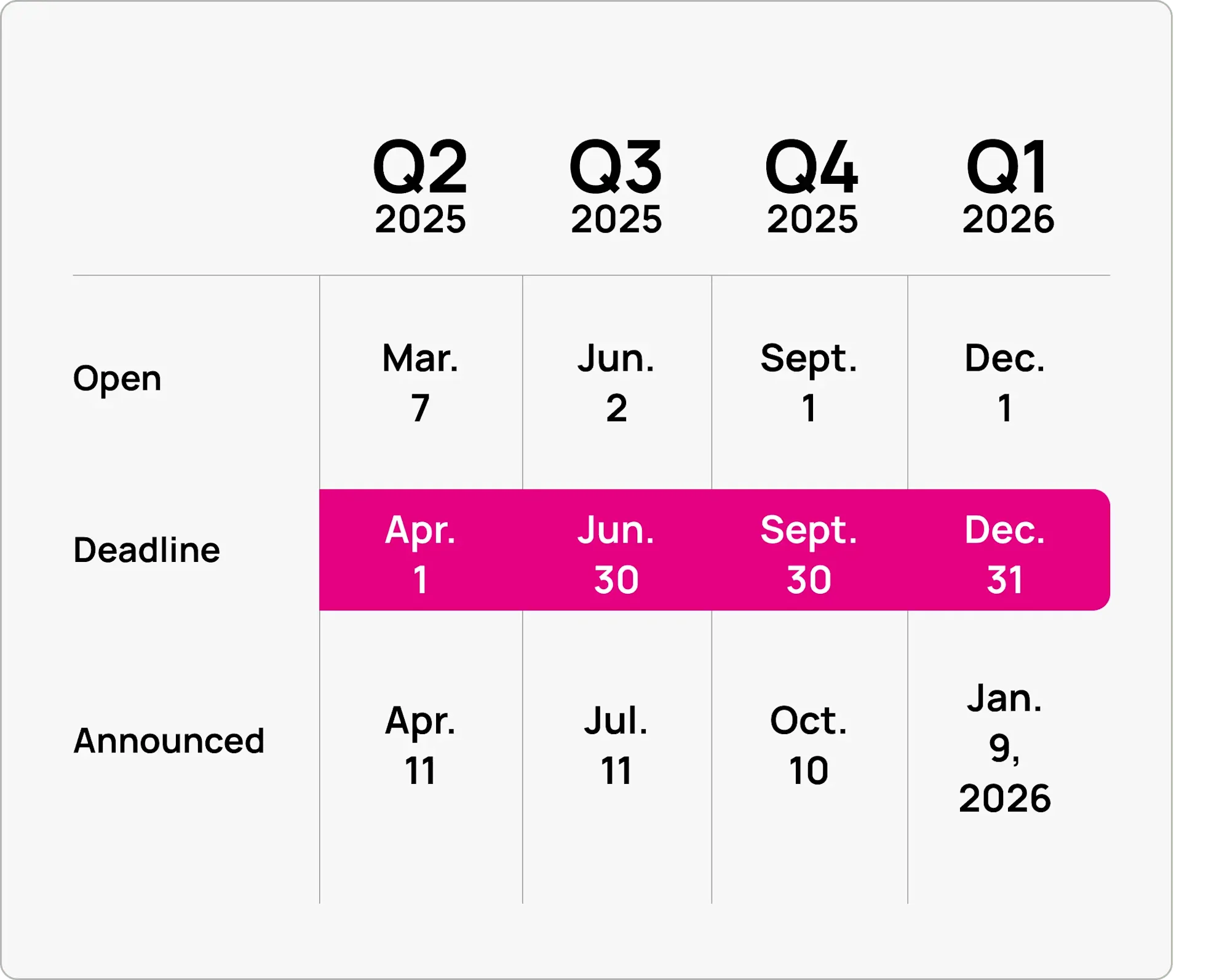 Submit your application before the deadline for the quarter.