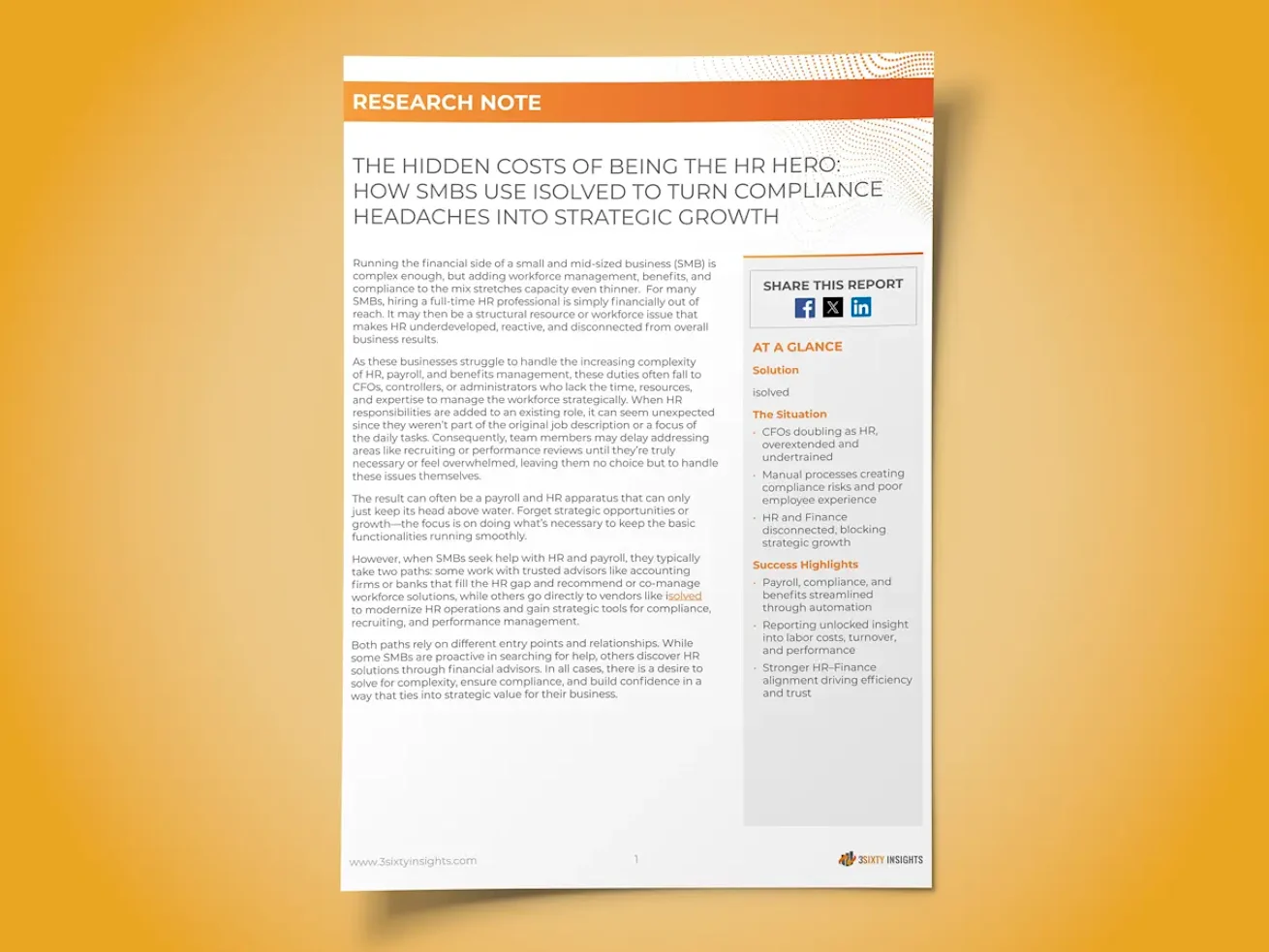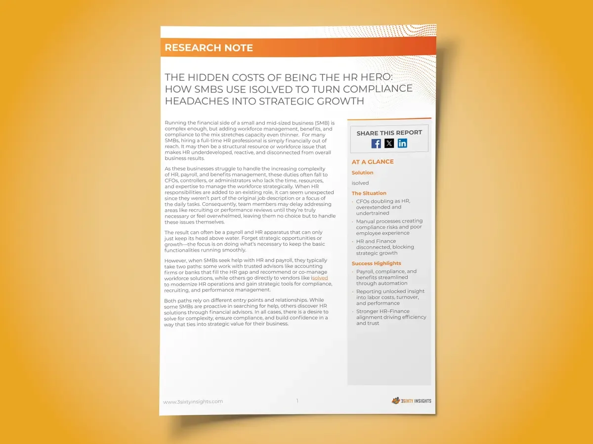 This research note from 3Sixty Insights shares insights from three isolved partners who work alongside clients facing these challenges. Their stories highlight how outsourcing HR and payroll and partnering with isolved People Cloud™ can reduce compliance risk, streamline processes and create more space for growth.