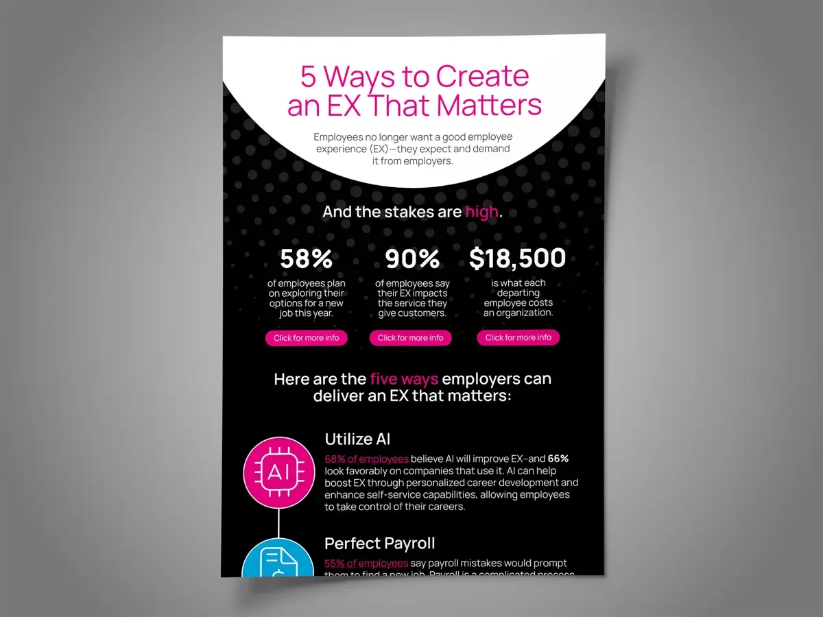 Employees no longer want a good employee experience (EX), they expect it. In this infographic, you’ll discover five highly actionable ways to create a workplace where people feel supported, engaged and ready to perform. From simplifying everyday processes to investing in meaningful development and trusting your technology, these strategies help you turn EX into a competitive advantage.