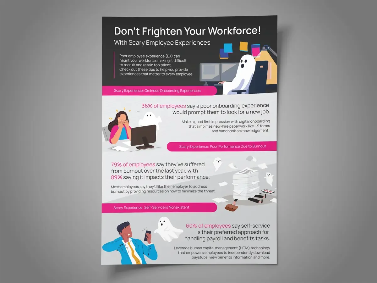 Scary employee experiences can negatively impact everything from recruitment to retention. This infographic identifies five scary experiences to watch out for, along with tips to help human resources (HR) teams deliver positive experiences to the entire workforce.
