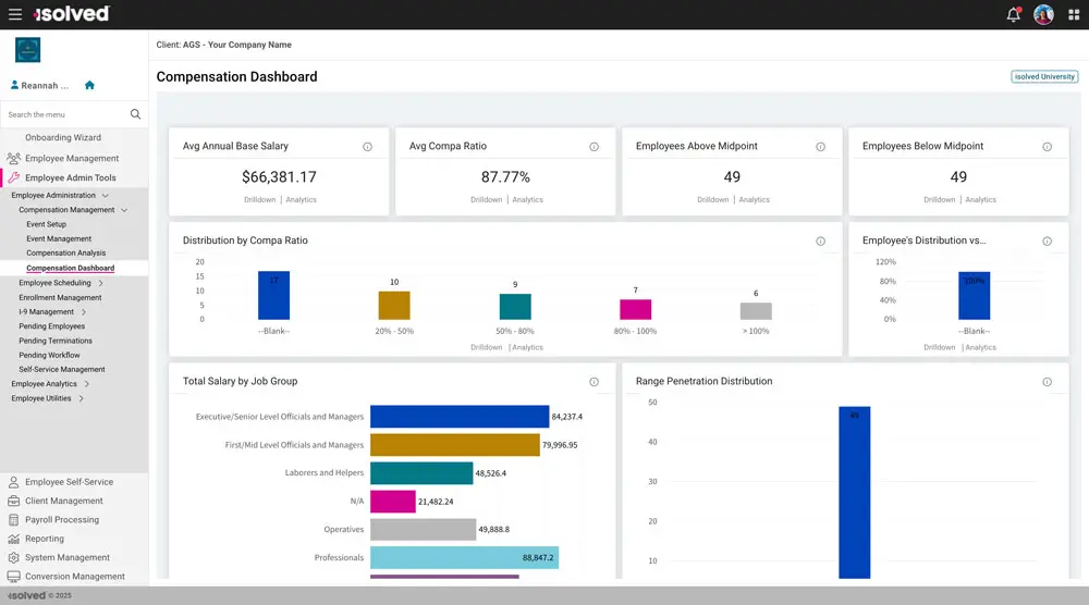 Gain intuitive insights from the Compensation Dashboard, powered by isolved Predictive People Analytics. Compare compa-ratios, review average base salaries and more to evaluate pay practices. With isolved Benchmark Insights, you can also analyze industry data to keep pay competitive and compliant.